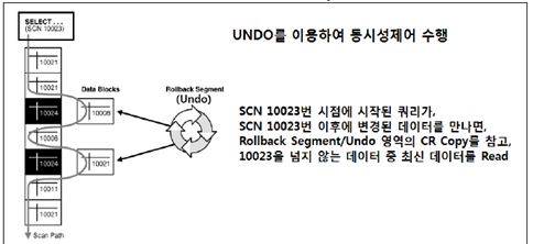 Undo 영역에 저장된 정보를 이용, CR Copy 를 생성하여 그것을 읽는다. (SCN 이용)