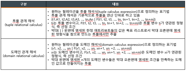 [구분] 투플 관계 해석(tuple relational calculus)와 도메인 관계 해석(domain relational calculus)으로 구분.