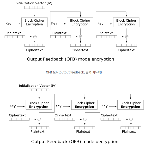 - OFB(평문길이=암호문길이, 암/복호키가동일)