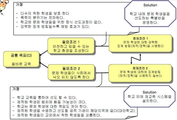 기업의 의사결정에 있어서 부서,조직간의 복잡하게 얽힌 문제들로 인해서 대립이 생기고 결국 논의자체도 진행되지 못하는 상황을 개선시키위해 근본원인을 찾아 이를 극복할 수 있는 혁신적인 방안을 도출하고 하기와 같은 일련의 과정을 논리적으로 파악해 나감.