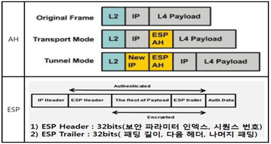 - ESP(Encapsulation Security Payload. 암호화 기법을사용하여 데이터의 무결성, 비밀성의 기능을 제공하는 프로토콜, 프라이버시 제공)